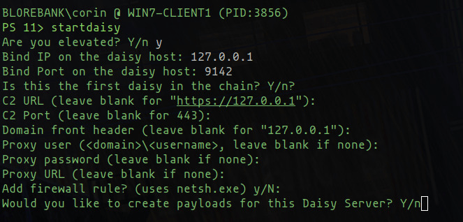 To help with this, we’ve added a wizard. Simply run startdaisy from the implant you want to use as the daisy server and it will guide the operator through the different options and situations before starting the daisy server on the current implant, and generate new daisy payloads that can be used to connect to this instance.