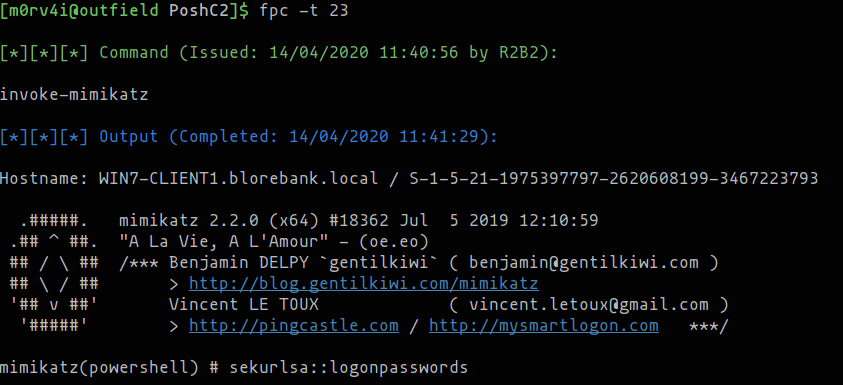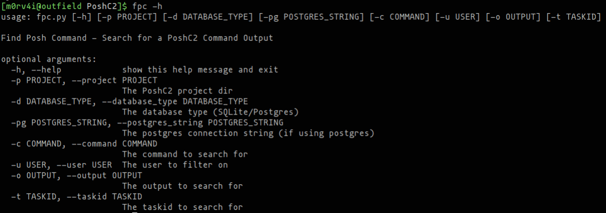 The fpc (Find PoshC2 Command) script is installed by PoshC2 to help with reporting and logging. When run from the command line, it allows users to search the PoshC2 database for commands or command output containing certain keywords. Rich Hicks (@Console) has significantly enhanced this script by improving its output to include the user and timestamp that run the particular command, in addition to adding a new filter for the taskId.