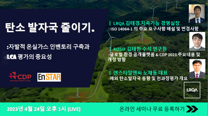 온실가스 배출량 검증(ISO 14064-1 ),  LCA (Life Cycle Assessment, 환경 전 과정 평가) 및 최신 2023 CDP 트랜드에 대해 각 분야의 전문가들을 모시고  진행될 예정입니다.